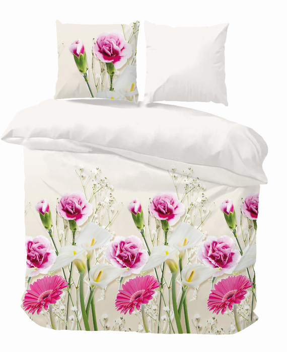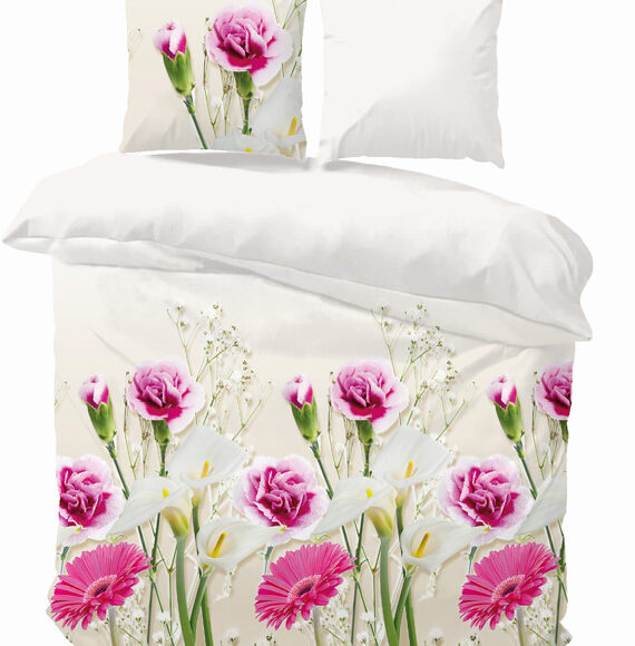 iSleep dekbedovertrek Boeket bevat een prachtige print met diverse roze, groene en witte bloemen op een licht beige achtergrond. De achterkant van dit overtrek is effen licht beige gekleurd. Dit overtrek is gemaakt van 100% hoogwaardige kwaliteit satijn katoen (250 TC).