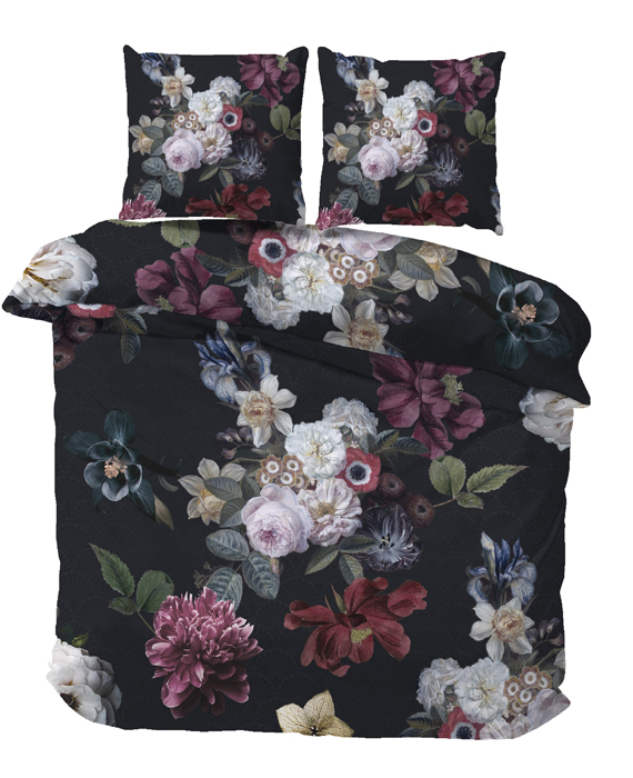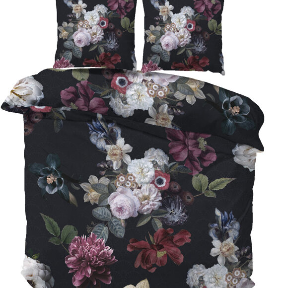 iSleep dekbedovertrek Jose toont prachtige kleurrijke bloemen en planten op een stijlvolle zwarte achtergrond. Het overtrek is gemaakt van 100% katoen satijn.