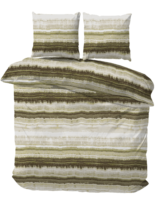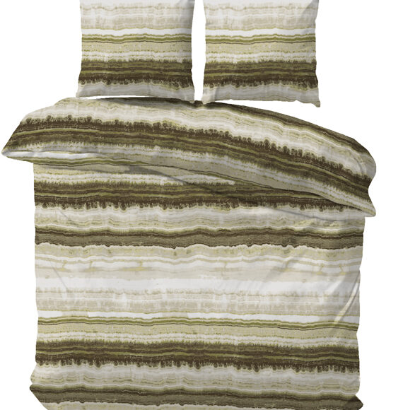 iSleep dekbedovertrek Riff heeft mooie horizontale banen in verschillende wit en groentinten. Het overtrek is gemaakt van 100% katoen satijn. Dit voelt zacht en soepel aan, heeft een comfortabele vochtregulatie en is goed wasbaar.