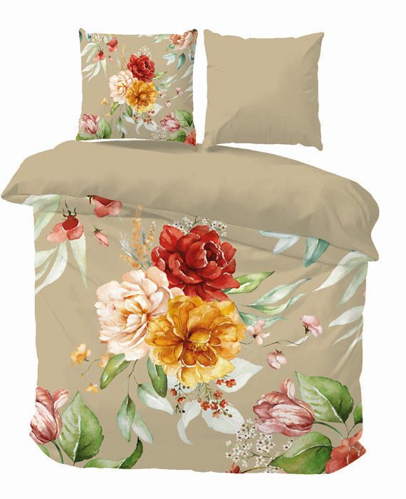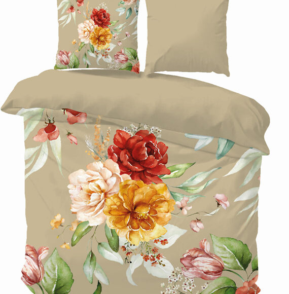 iSleep dekbedovertrek Simone bestaat uit een prachtige bloemenprint op een zandkleurige achtergrond. De achterkant van dit overtrek is effen. Dit overtrek is gemaakt van 100% hoogwaardige kwaliteit satijn katoen (250 TC).